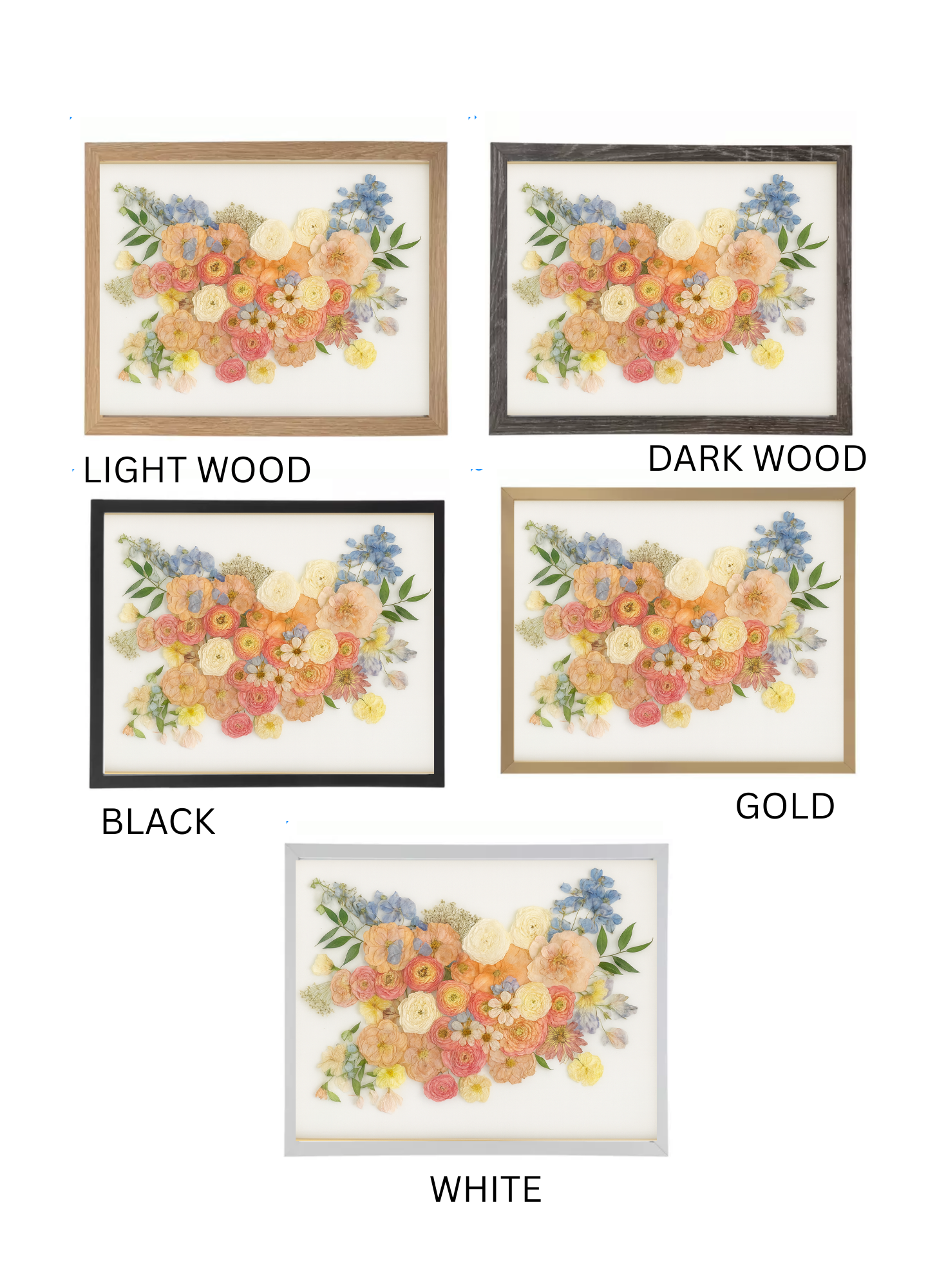 Once you've chosen this size, simply select your preferred frame color, add your wedding date, choose a design style, and share any other personal details you'd like us to include. We'll take care of the rest, creating a timeless keepsake that reflects the beauty of your flowers and your unforgettable day.
